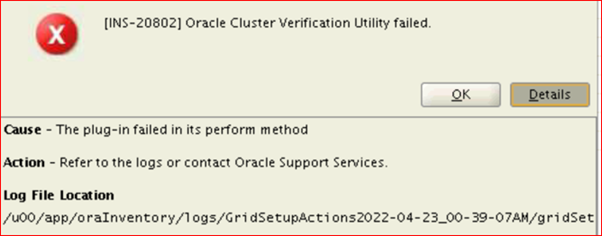 Error: [INS-20802] Oracle Cluster verification Utility failed
