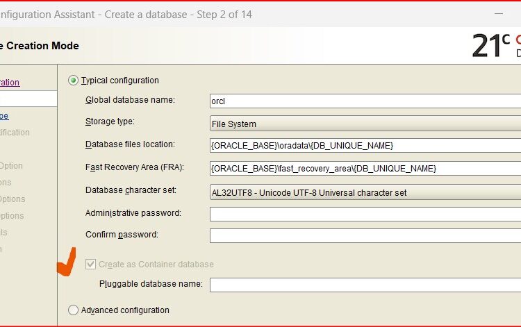 See below check box is disabled/Greyed out , we can not select. So we can only create CDB database from 21c Version.